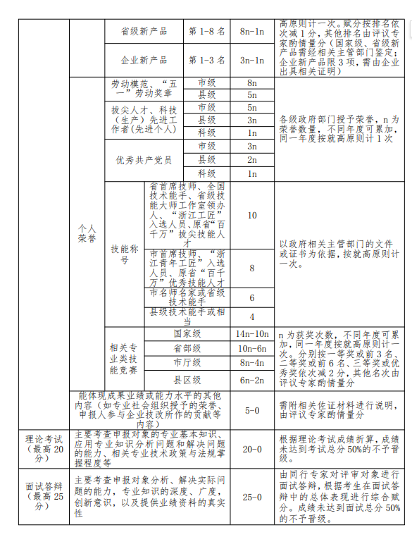 第七條 申報對象可結(jié)合自身條件選擇以下申報方式之一 進行申報: (一)正常申報 申報資格 學歷要求 專業(yè)任職(工作)年限要求 技術(shù)員 大專畢業(yè)(非相關(guān)相近專業(yè)) 從事機械相關(guān)技術(shù)工作 2 年以上 高中畢業(yè) 從事機械相關(guān)技術(shù)工作 6 年以上 助理工程師 大專畢業(yè)(相關(guān)相近專業(yè)) 取得技術(shù)員資格后,實際擔(聘)任 技術(shù)員職務(wù) 1 年以上 大專畢業(yè)(非相關(guān)相近專業(yè)) 從事機械相關(guān)技術(shù)工作 5 年以上 中專畢業(yè)(相關(guān)相近專業(yè)) 取得技術(shù)員資格后,實際擔(聘)任 技術(shù)員職務(wù) 4 年以上 中專畢業(yè)(非相關(guān)相近專業(yè)) 或高中畢業(yè) 從事機械相關(guān)技術(shù)工作 10 年以上 工程師 研究生學歷或碩士學位(相關(guān) 相近專業(yè)) 取得助理工程師資格后,實際擔(聘) 任助理工程師職務(wù) 2 年以上 大專以上學歷畢業(yè)(相關(guān)相近 專業(yè)) 取得助理工程師資格后,實際擔(聘) 任助理工程師職務(wù) 4 年以上 (二)業(yè)績自評分申報 申報對象不符合正常申報條件,但具備以下條件,且按附 件量化評價標準,其業(yè)績自評分(理論考試和面試答辯分除外達到 25 分,可經(jīng) 2 名機械專業(yè)相關(guān)領(lǐng)域副高級職稱以上專家署 名舉薦后,申報工程師資格: 1.高中學歷或非相關(guān)相近專業(yè)中專學歷,專業(yè)工作年限 15 年以上; 2.相關(guān)相近專業(yè)中專學歷或非相關(guān)相近專業(yè)大專學歷,專 業(yè)工作年限 10 年以上; 3.相關(guān)相近專業(yè)大專學歷或非相關(guān)相近專業(yè)本科學歷,專 業(yè)工作年限 7 年以上; 4.相關(guān)相近專業(yè)本科學歷,專業(yè)工作年限 5 年以上。 (三)技能人才申報 申報資格 條件要求 技術(shù)員 取得機械相關(guān)職業(yè)(工種)中級工職業(yè)資格或職業(yè)技能等級后,從 事技術(shù)技能工作滿 2 年 助理工程師 取得機械相關(guān)職業(yè)(工種)高級工職業(yè)資格或職業(yè)技能等級后,從 事技術(shù)技能工作滿 2 年 省級一類技能競賽前五名、省級二類技能競賽前三名、市級技能大 師工作室領(lǐng)辦人、省“百千萬”高技能領(lǐng)軍人才培養(yǎng)工程中入選的 “優(yōu)秀技能人才” 工程師 取得機械相關(guān)職業(yè)(工種)技師職業(yè)資格或職業(yè)技能等級后,從事 技術(shù)技能工作滿 3 年 世界技能大賽優(yōu)勝獎獲得者、國家級一類技能競賽前五名、國家級 二類技能競賽前三名、省技術(shù)能手、省級技能大師工作室領(lǐng)辦人、 浙江工匠、省“百千萬”高技能領(lǐng)軍人才培養(yǎng)工程中入選的“拔尖 技能人才” (四)轉(zhuǎn)兼評申報 任其他專業(yè)助理工程師職務(wù) 1 年以上,因?qū)I(yè)技術(shù)崗位變 動或工作需要,符合申報條件的,可轉(zhuǎn)(兼)評機械專業(yè)助理 工程師資格。任其他專業(yè)工程師職務(wù) 1 年以上,因?qū)I(yè)技術(shù)崗位變動或工作需要,符合申報條件的,可轉(zhuǎn)(兼)評機械專業(yè) 工程師資格。 (五)標志性業(yè)績直接申報 申報對象具有下列標志性成果之一,且理論考試和面試答 辯合格的,經(jīng)評委會審議通過,可直接晉升工程師任職資格。 1.獲機械專業(yè)領(lǐng)域省部級(國家級行業(yè))科技獎項一等獎 (排名前 9),或二等獎項(排名前 7),或三等獎(排名前 5); 市廳級(省級行業(yè))科技獎項一等獎(排名前 5),或二等獎(排 名前 3),或三等獎(排名前 5)2 項。 2.機械專業(yè)領(lǐng)域國家標準、行業(yè)標準的主要起草者(排名 前 3); 3.具備下列條件中的 2 項:縣級以上政府授予的勞動模范、 拔尖人才、科技(生產(chǎn))先進工作者;市級以上相關(guān)專業(yè)競賽 類獎項主要獲獎?wù)撸ㄅ琶?3);機械類地方標準、團體標準的 主要起草者(排名前 3);2 個以上機械領(lǐng)域省級新產(chǎn)品(通過 鑒定)的主要開發(fā)者(排名前 3)。 (六)大中專畢業(yè)生職稱初定 取得以下學歷(學位),經(jīng)考核合格,可按社保繳納屬地 原則,向各級人力社保部門申請初定機械專業(yè)中、初級專業(yè)技 術(shù)資格: 1.取得本專業(yè)或相近專業(yè)中專學歷后,實際從事專業(yè)工作 滿 1 年,經(jīng)考核合格,可初定技術(shù)員資格。 2.取得本專業(yè)或相近專業(yè)大學本科學歷后,實際從事專業(yè) 工作滿 1 年,或取得本專業(yè)或相近專業(yè)大學專科學歷后,實際從事專業(yè)工作滿 3 年,經(jīng)考核合格,可初定助理工程師資格。 3.具有本專業(yè)或相近專業(yè)研究生學歷或碩士學位者,從事 專業(yè)工作滿 3 年(學歷或?qū)W位取得前后從事本專業(yè)或相近專業(yè) 的工作年限可以累加,但學歷或?qū)W位取得后從事專業(yè)工作須滿 1 年),或具有本專業(yè)或相近專業(yè)博士學位者,經(jīng)考核合格的, 可初定工程師資格。
